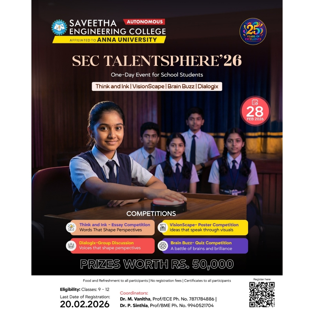🔥 Experience strategy, skill, and sharp thinking at “SEC TALENTSPHERE’26” — a one-day event for school students (Classes 9–12) conducted by Saveetha Engineering College (Autonomous).