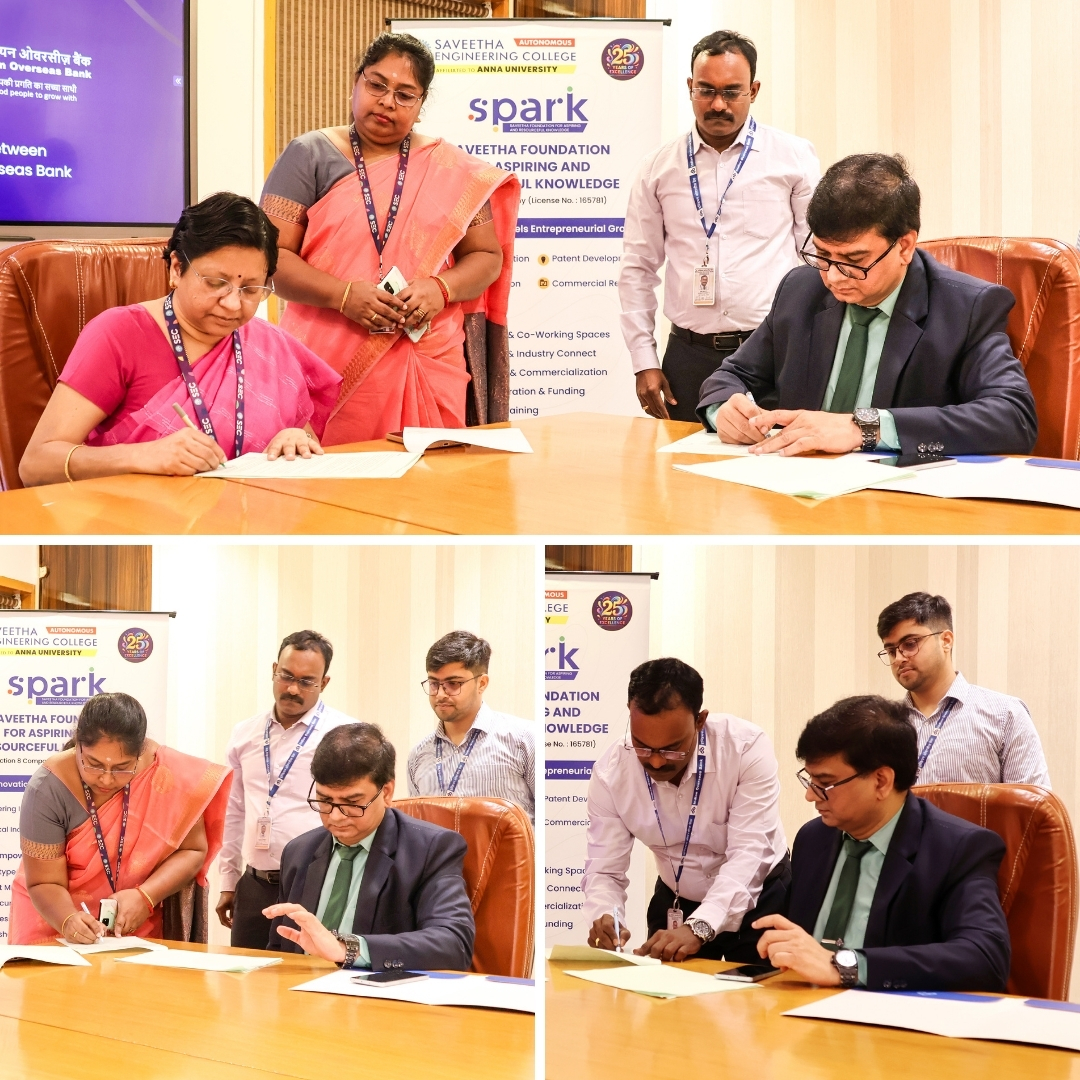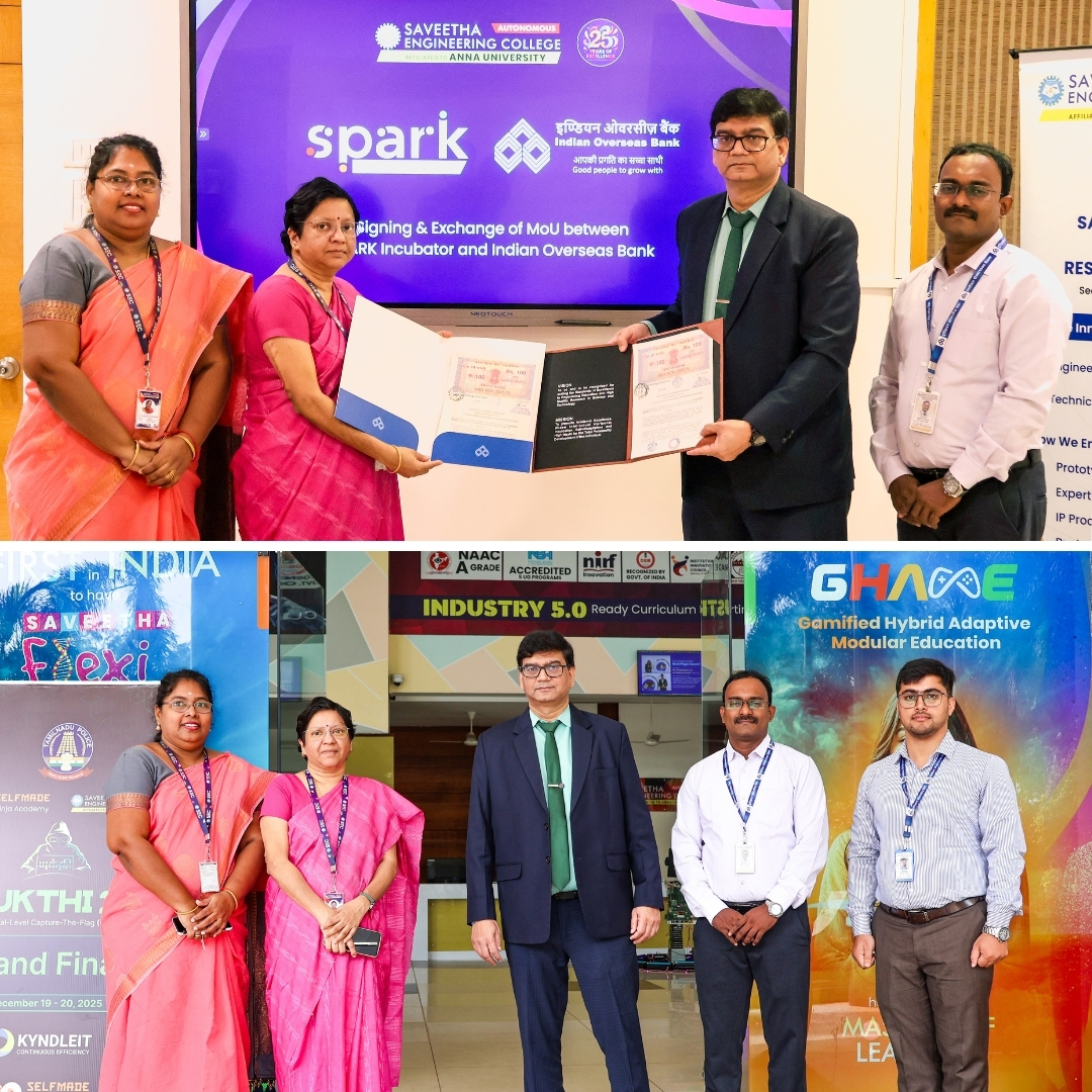 ✍️ Saveetha Engineering College (Autonomous) entered into a landmark collaboration with the signing and exchange of an MoU between the “Saveetha Foundation for Aspiring and Resourceful Knowledge (SPARK) Incubator” and Indian Overseas Bank (IOB) on Dec. 22, 2025.