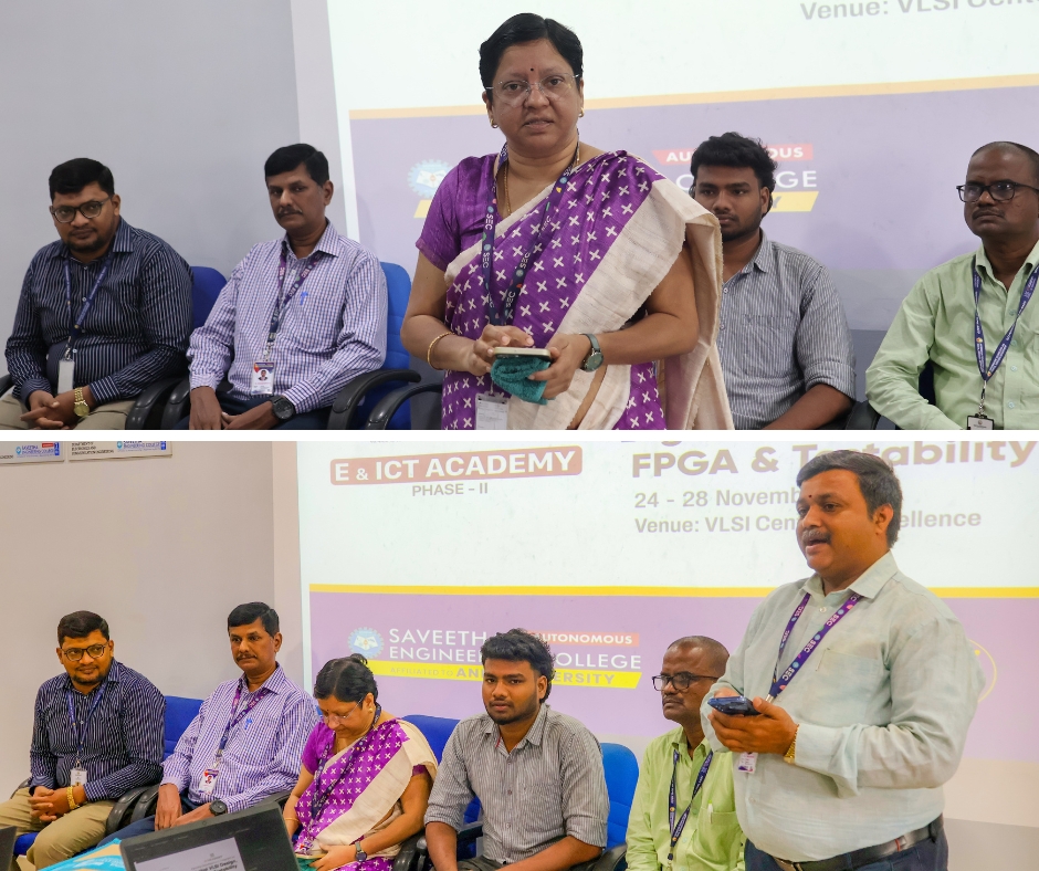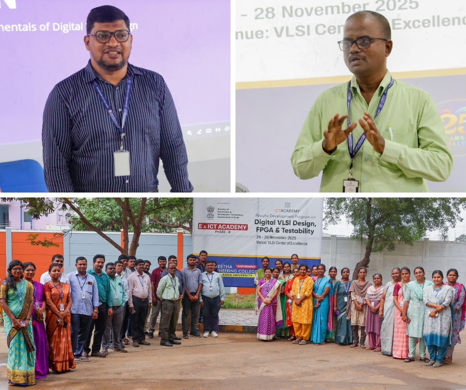 🎉 Saveetha Engineering College (Autonomous), in proud collaboration with E&ICT Academy, Meity, GoI, inaugurated a 5-Day Faculty Development Program on “Digital VLSI Design, FPGA & Testability” through ICT Academy as Implementation partner on 24th Nov 2025 at our state-of-the-art “VLSI Centre of Excellence” — becoming the First Engineering Institution in Tamil Nadu to host such an advanced industry-aligned FDP on ESDM Domain. This program will continue till 28th Nov. 2025.