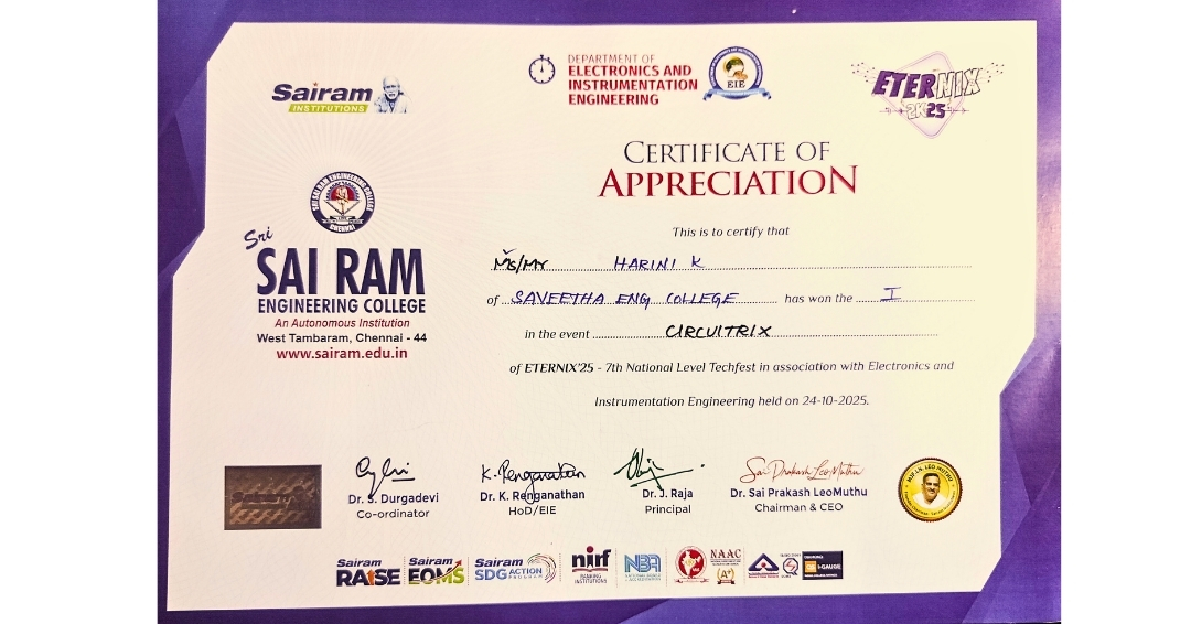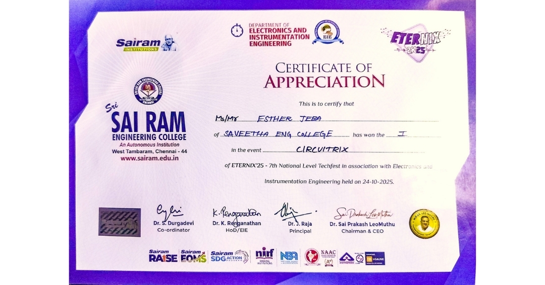 🎉 Heartfelt congratulations to J. Esther Jeba and Harini K., II Year ECE, for winning 1st Place at the “National-Level Technical Symposium – Eternix” hosted by Sairam Engineering College!