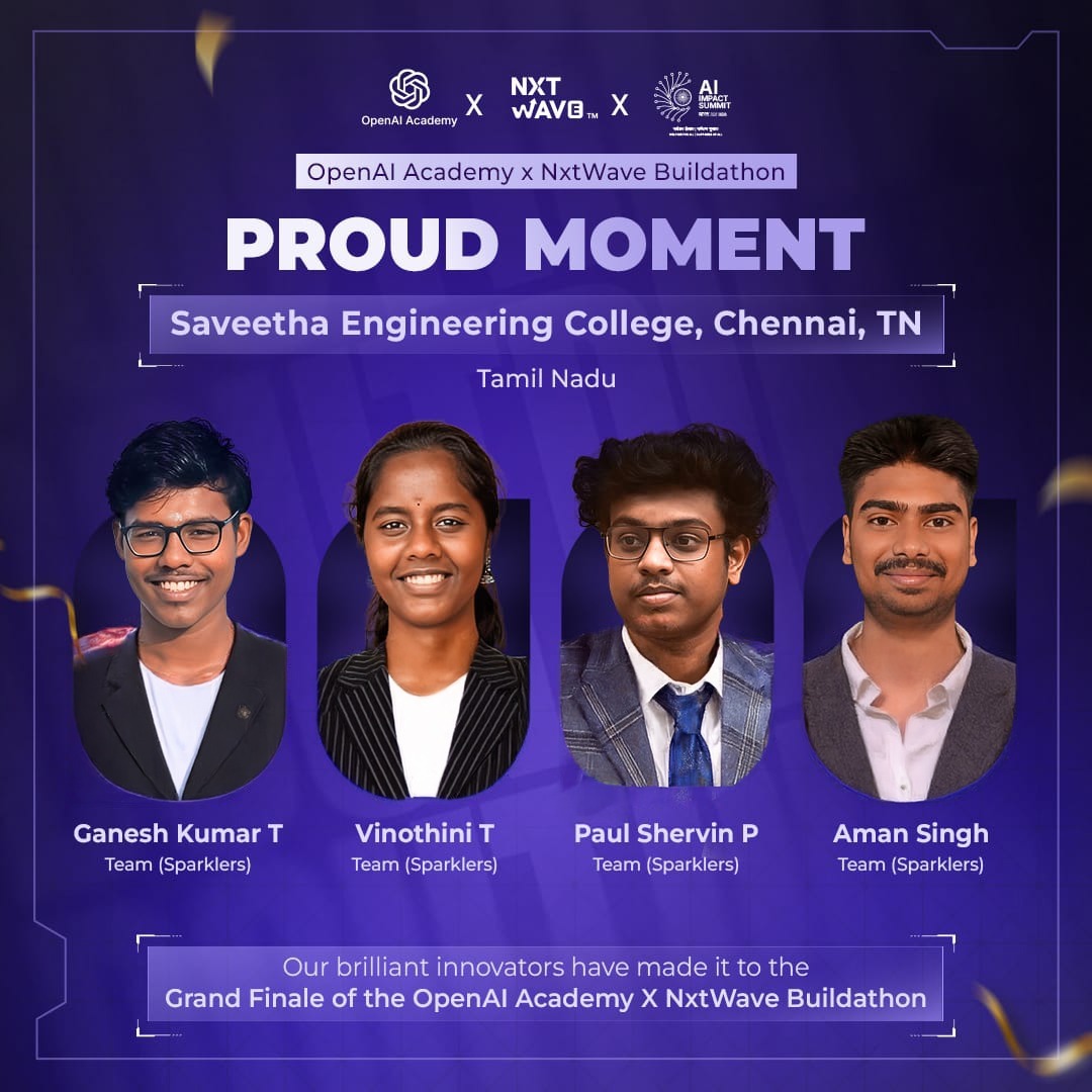 🎉 We’re excited to share that Saveetha Engineering College (Autonomous), has qualified for the “Grand Finale of the OpenAI Academy X NxtWave Buildathon”.