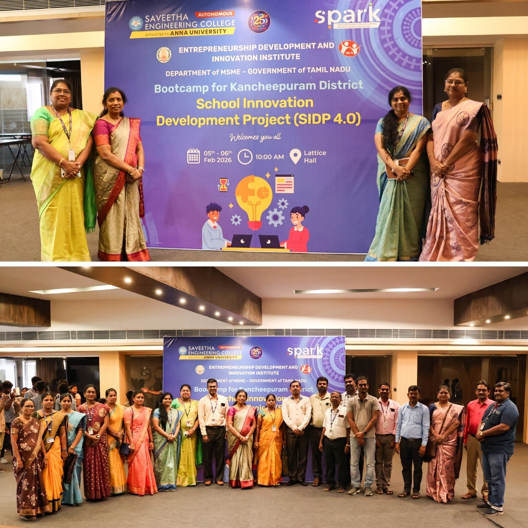 🎉 Saveetha Engineering College (Autonomous) proudly hosted SIDP 4.0 Bootcamp for Kancheepuram District, empowering young school innovators with ideas, skills, and entrepreneurial spirit. Organized by EDII–Tamil Nadu under MSME, Govt. of Tamil Nadu, in collaboration with the School Education Department and supported by UNICEF, the program fostered creativity, problem-solving, and innovation mindset among future changemakers.