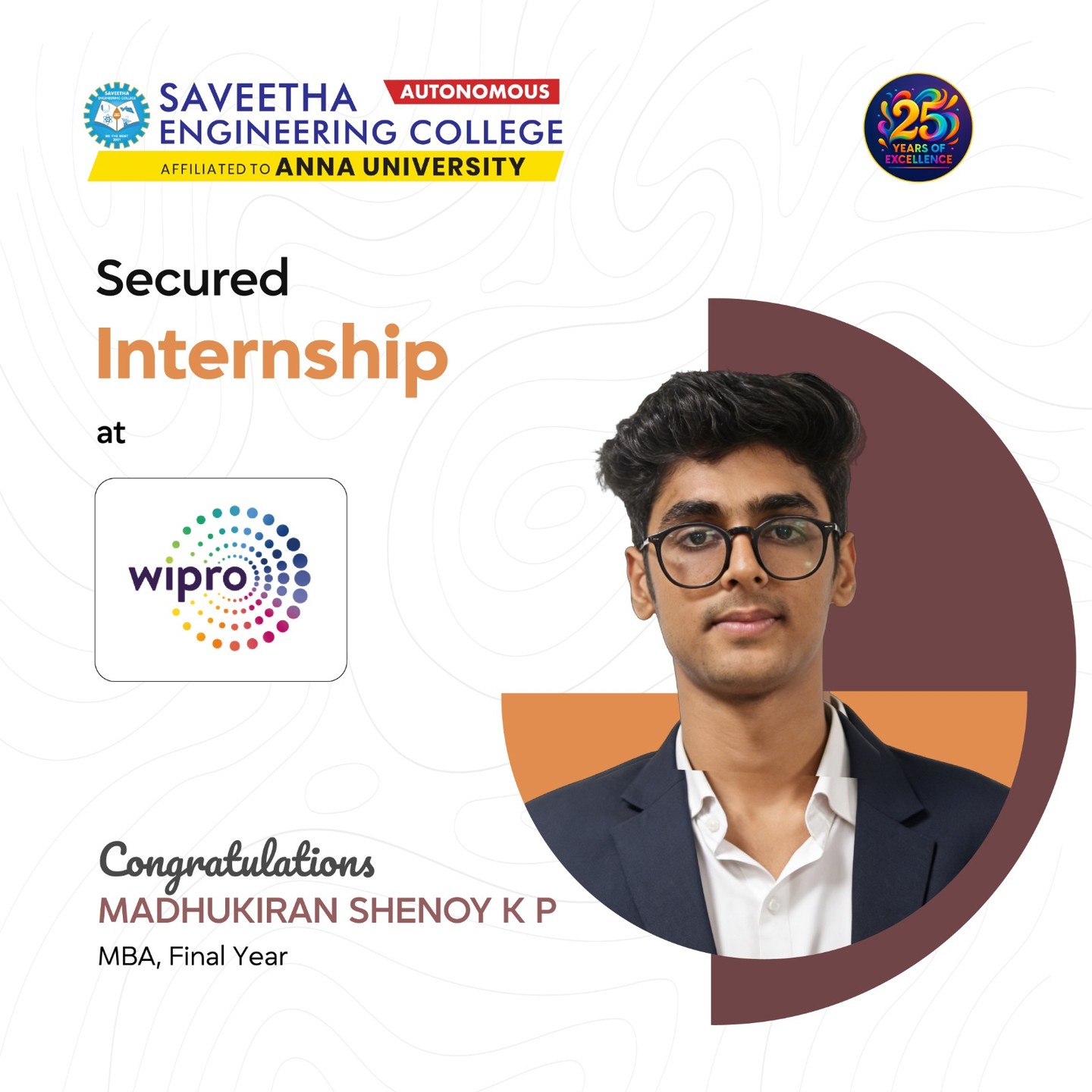 ✨ Madhukiran Shenoy K P, MBA Final Year, secures a prestigious Internship at “Wipro”! 💼::💥
