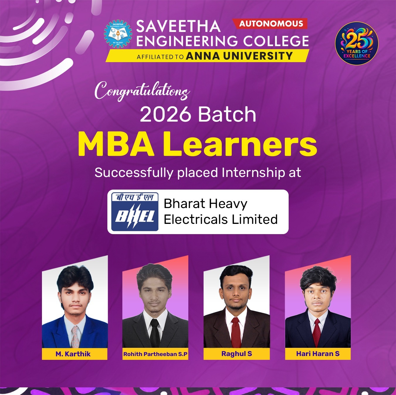 🎉 Our 2026 Batch MBA learners secured prestigious Internships with “Bharat Heavy Electricals Limited (BHEL)”.