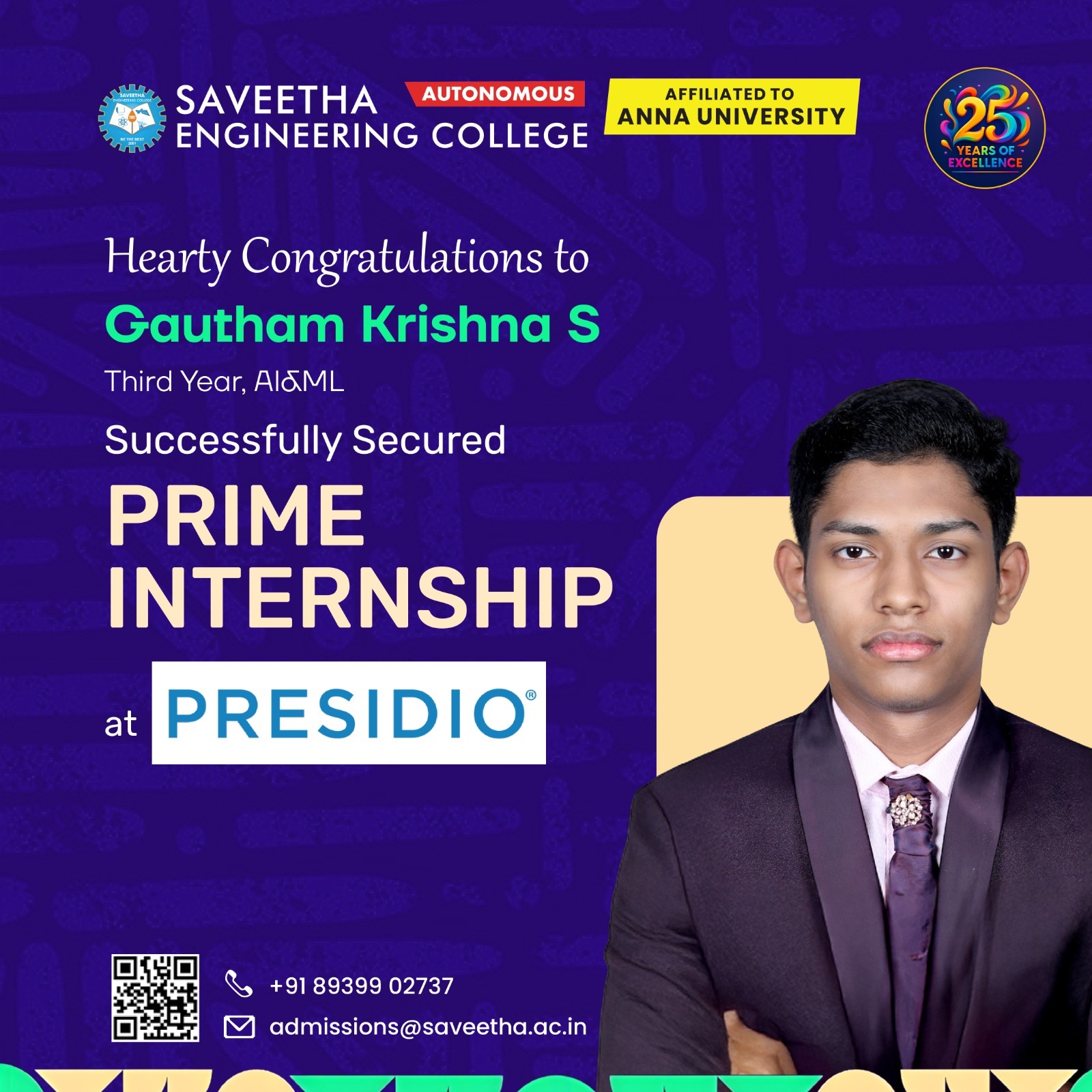 🎉 Hearty congratulations to Gautham Krishna S, III year AI&ML learner, for securing a Prime