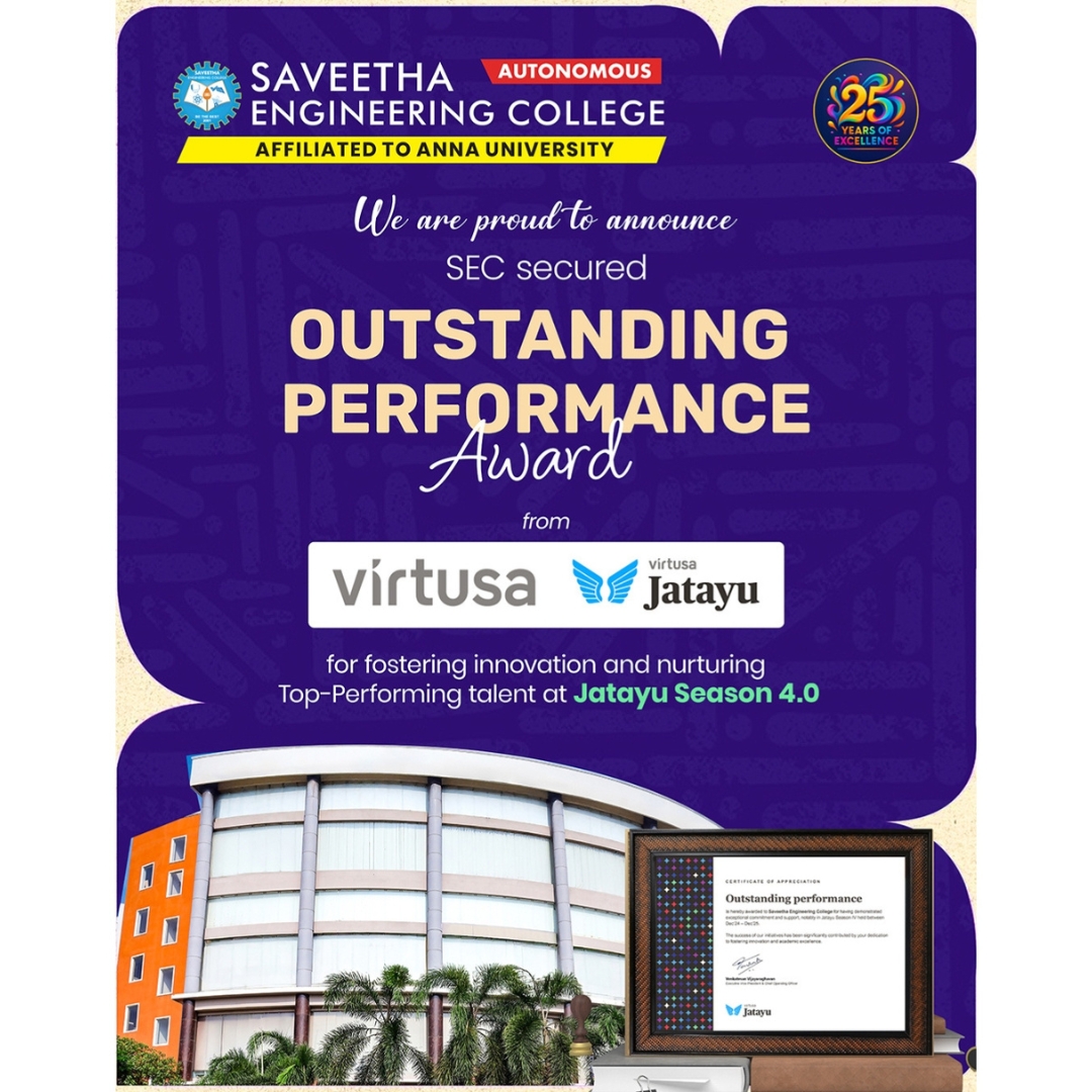 🏆 Saveetha Engineering College (Autonomous) proudly secured the “Outstanding Performance Award” from Virtusa at Jatayu