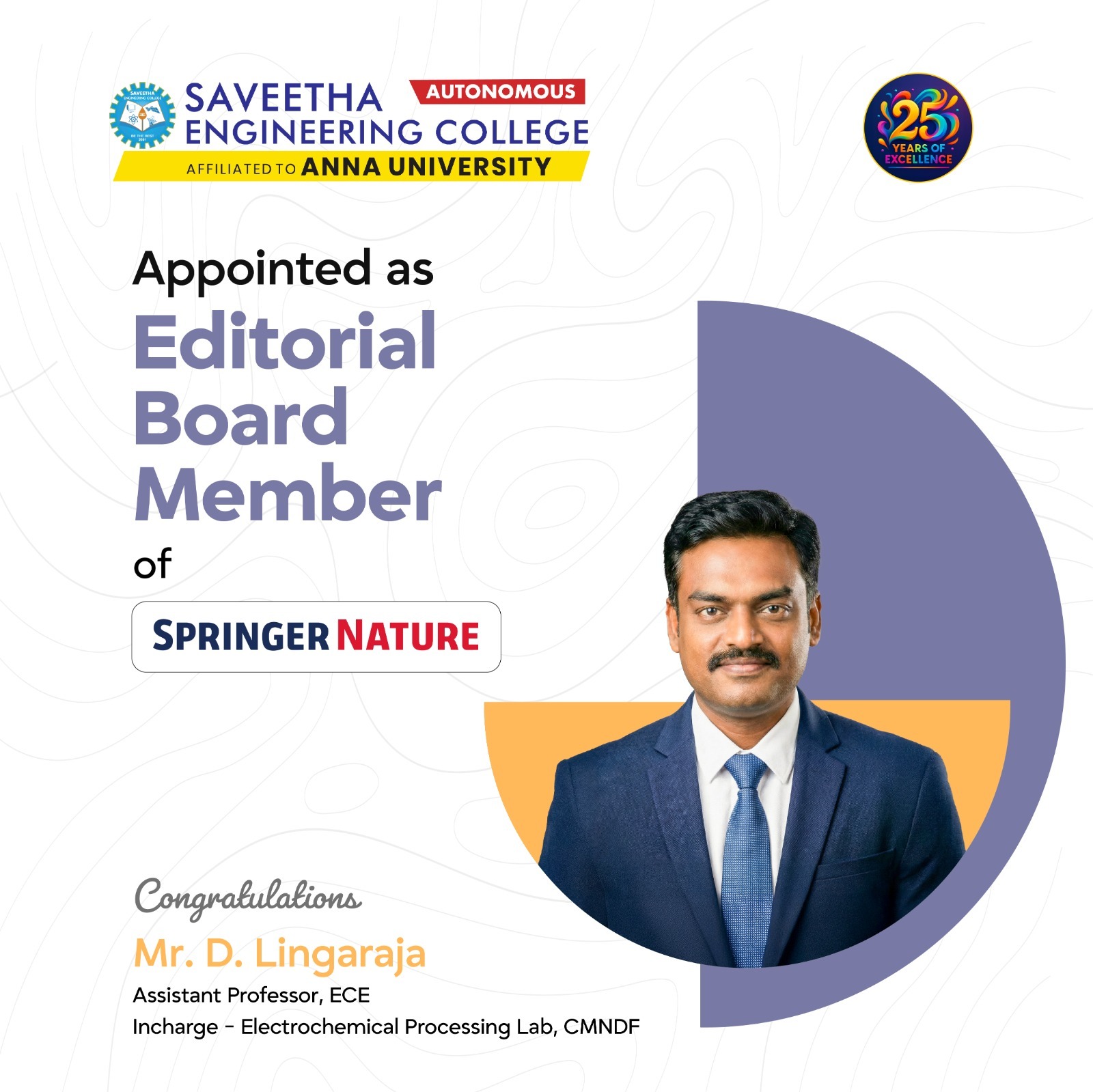 🎉 Saveetha Engineering College (Autonomous) congratulates Mr. D. Lingaraja, Asst. Prof., ECE and Incharge – Electrochemical Processing Lab and Centre for Micro Nano Design & Fabrication (CMNDF), on his prestigious appointment to the “Editorial Board Member of Springer Nature”! 📚 …