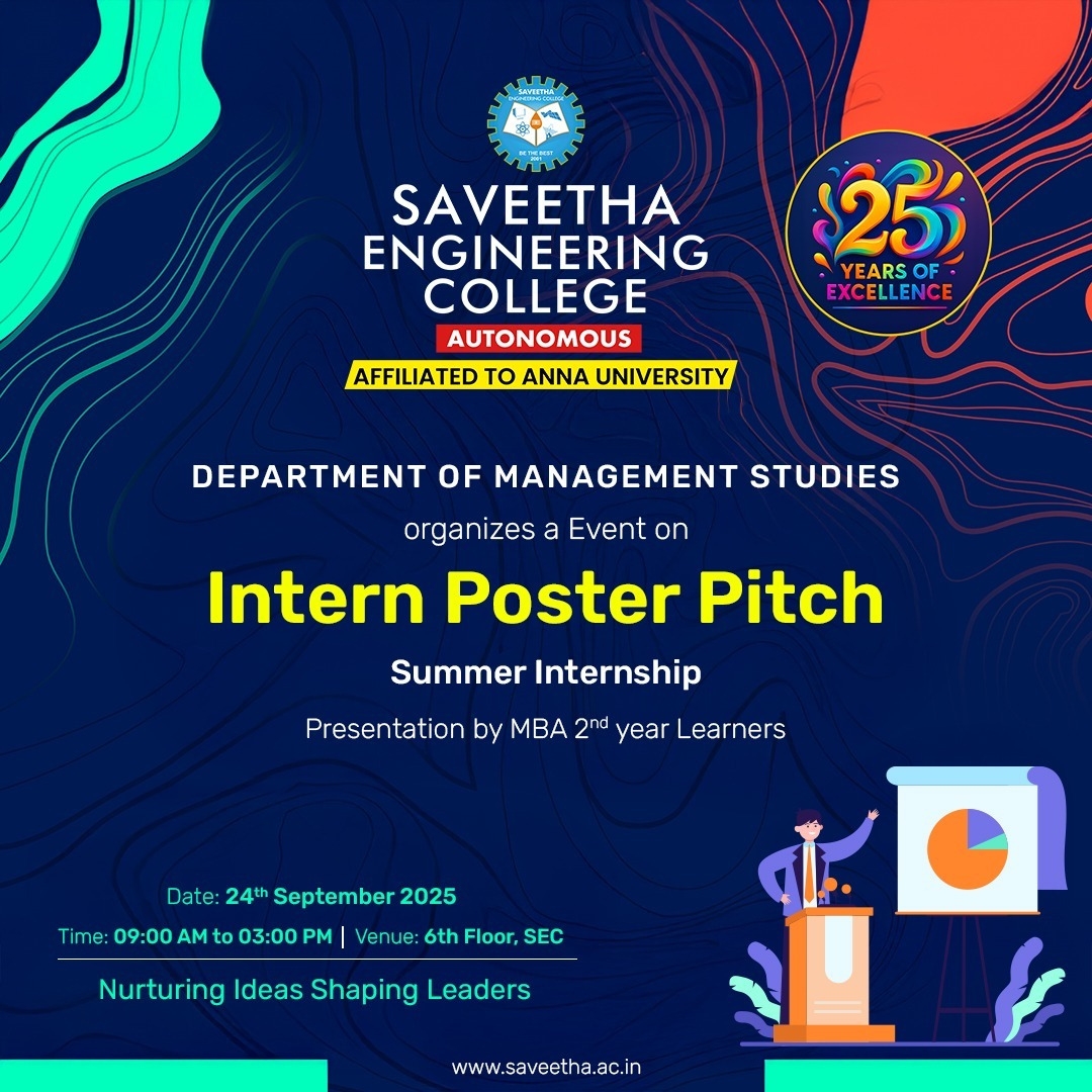 🚀 The MBA 2nd year learners from the Department of Management Studies, SEC, proudly present the “Intern Poster Pitch”, an innovative poster presentation showcasing ideas, industry insights, and leadership skills gained through Summer Internships. 🗓️ Date: 24th September 2025🕘 Time: …