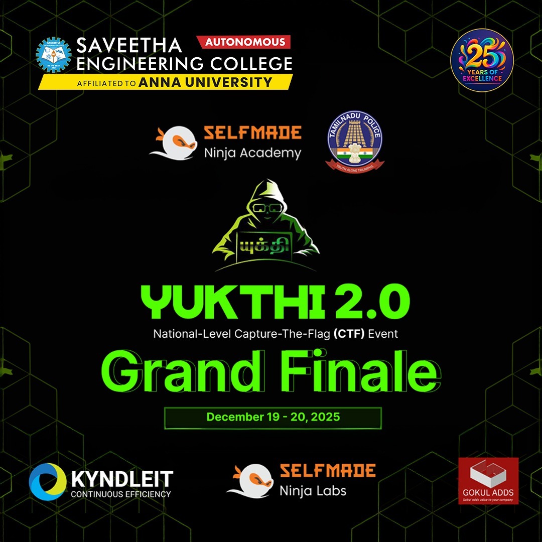 🚀 A hearty welcome to the Grand Finale of Yukthi 2.0 Hackathon — a National-Level Capture-the-Flag (CTF) event coming alive at Saveetha Engineering College (Autonomous) from Dec 19th to 20th, 2025. 💫 An ultimate showdown where skill meets strategy, and …