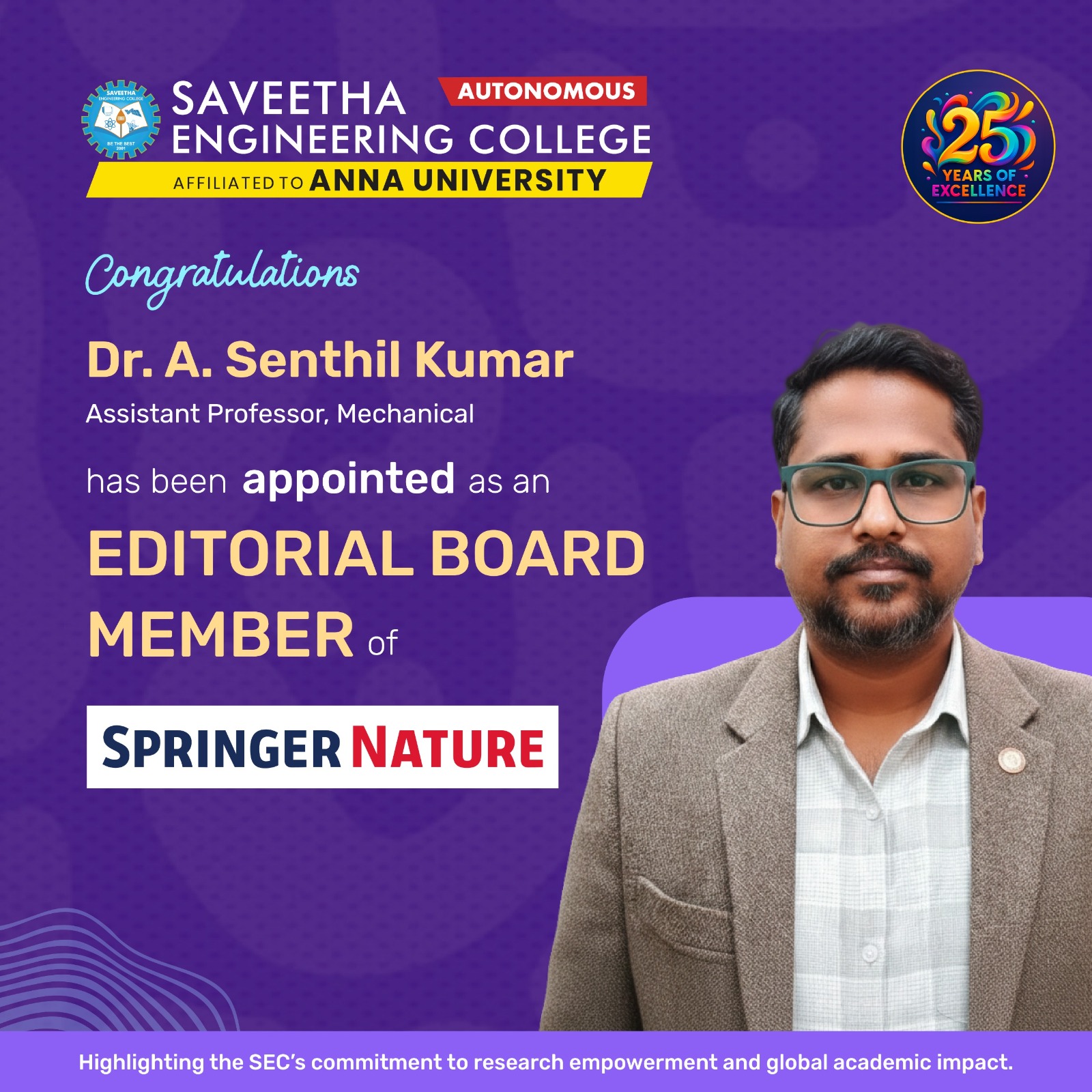 🎉 Big applause to Dr. A. Senthil Kumar, Assistant Professor, Mechanical Engineering, on his prestigious appointment as an Editorial Board Member of Springer Nature. 📚 “Springer Nature” is a leading global publisher advancing scientific research through high-quality journals, books, and …