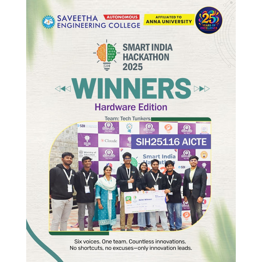 ✨ Saveetha Engineering College (Autonomous) proudly announces that “Team Tech Tunkers” has emerged as the National Champion of the “Smart India Hackathon (SIH) 2025 – Hardware Edition”. 💡 This achievement reflects our learners’ strong commitment to addressing real-world challenges of …