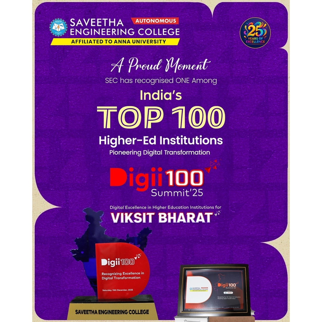 🎉 Saveetha Engineering College (Autonomous) proudly earns national recognition at the Digii100 Summit’25, being named “One among India’s Top 100 Higher Education Institutions” that are pioneering Digital Transformation. 🌟 This honour reflects SEC’s commitment to innovation, autonomy, and future-ready education—setting …