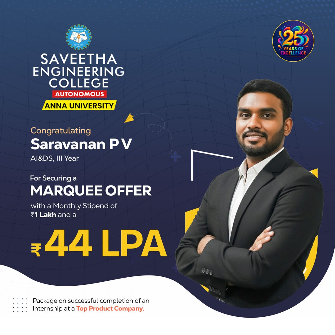 🎉 Big applause to Saravanan P V (AI&DS, III Year) for securing a MARQUEE OFFER with a ₹1 Lakh Monthly Stipend and an exceptional ₹44 LPA Package upon Internship completion . ✨ His success showcases SEC’s legacy of shaping innovators, …